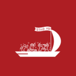 Stag Cruise Budapest logo with a white party boat, dancing stick figures, and a STAG VIP flag on a red background.